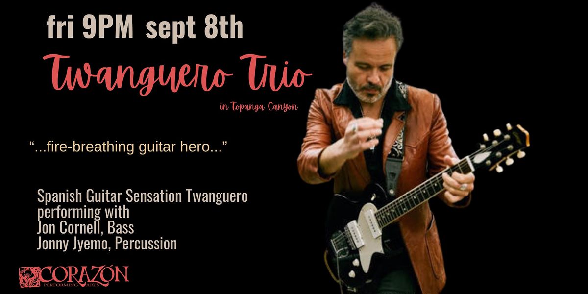 Spanish guitar phenomenon El Twanguero is back, with new compositions and a twangy Cumbia-kinda- night with Jon Cornell on Bass and Jonny Jyemo on drums at eclectic Corazon Performing Arts space in Topanga Canyon, CA on Friday, Sept 8th, 2023 at 9PM for a very special performance.