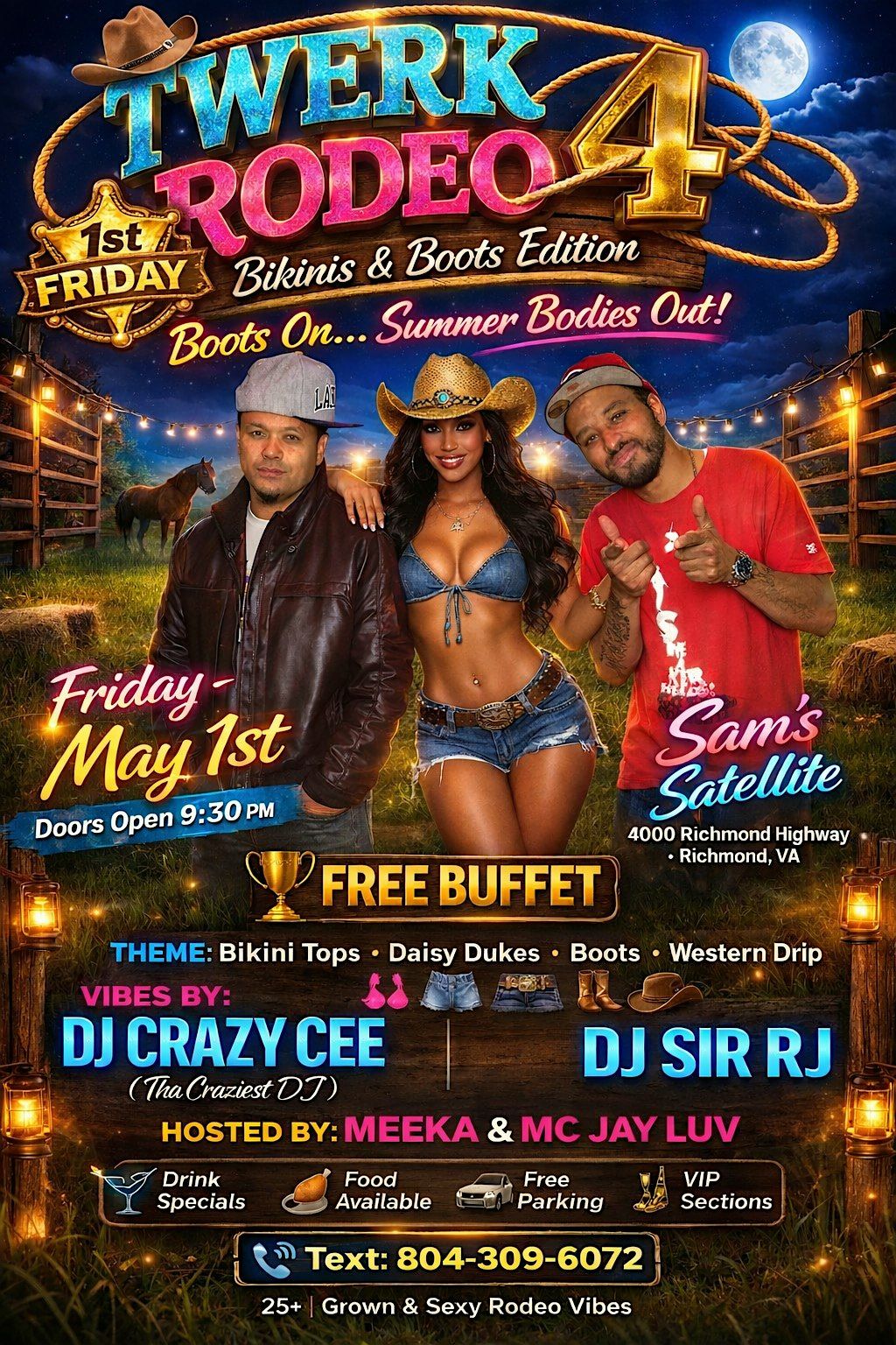 1st Friday Twerk Rodeo is back. Bikinis & Boots Edition FREE BUFFET DJ CRAZY CEE DJ SIR RJ MC JAY LUV MEEKA 9:30pm til 2am