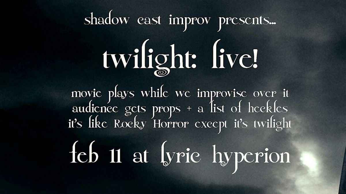 TWILIGHT: An Unofficial Comedians Shadow Casting Parody/Watch Party. It's kind of like Rocky Horror Live except it's HSM. We'll watch our very special cast of comics doing their own playing out of the scenes on stage versus the movie (as the movie plays).
