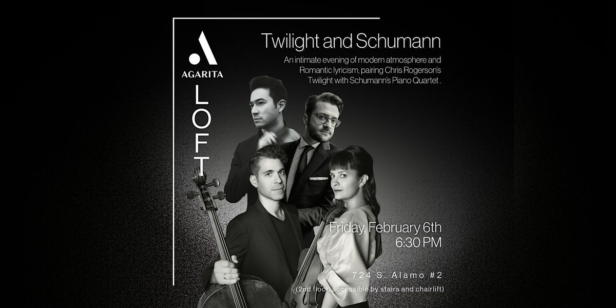 An intimate evening of modern atmosphere and Romantic lyricism, pairing Chris Rogerson’s Twilight with Schumann’s Piano Quartet in the Agarita Loft.