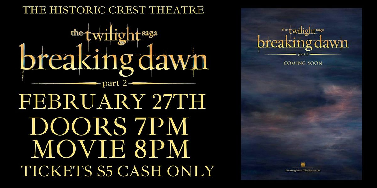 Get ready for an epic night as we watch the final chapter of Twilight come to life on the big screen. This in-person event is perfect for all fans who want to relive the thrilling conclusion of Bella and Edward's story. Bring your friends, grab some popcorn, and dive into the vampire romance that started it all. Don’t miss out on this unforgettable movie night!