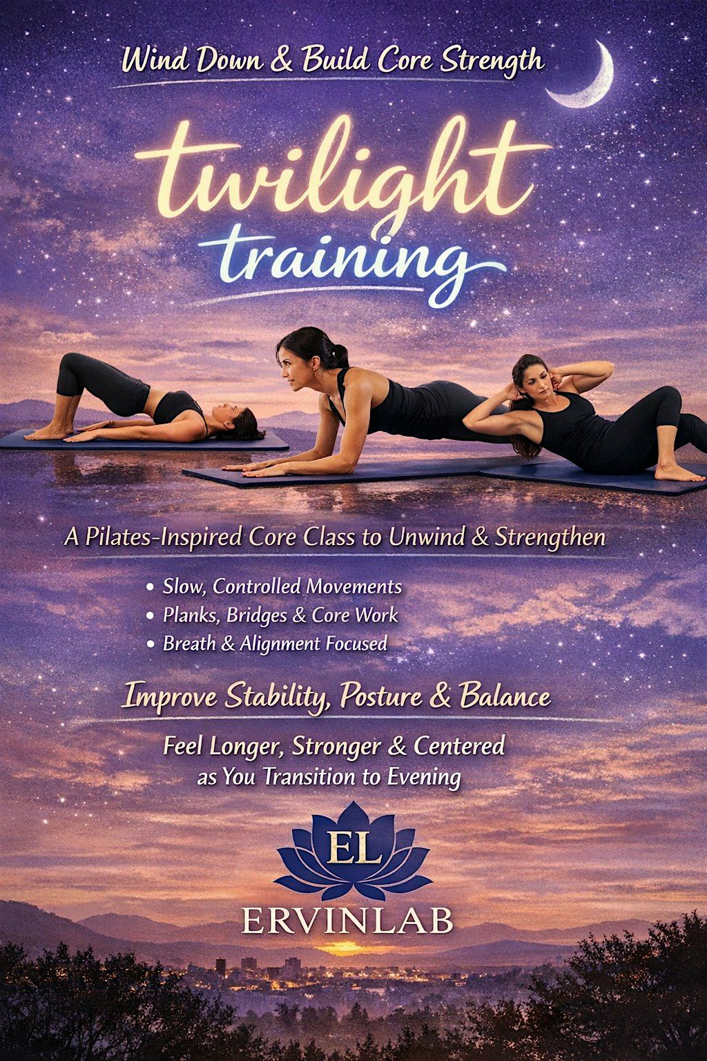 Wind down your day while building strength from the inside out. Twilight Training is a Pilates-inspired core class designed to improve stability, posture, and total-body control through slow, intentional movement. This session focuses on strengthening the deep abdominal muscles, glutes, and lower back, the foundation of a strong, resilient body. Using controlled Pilates principles like breath, alignment, and core engagement, you’ll move through a series of mat-based exercises that challenge balance, coordination, and muscular endurance without high impact. Expect movements such as planks, bridges, controlled leg work, and rotational core patterns that sculpt and strengthen while promoting mobility. Perfect for all levels, this class helps reduce tension from the day, improve posture, and build a strong, stable core that supports everything from workouts to everyday life. Outcome: You’ll leave feeling longer, stronger, and centered, like the perfect reset between the busy day and the evening ahead.