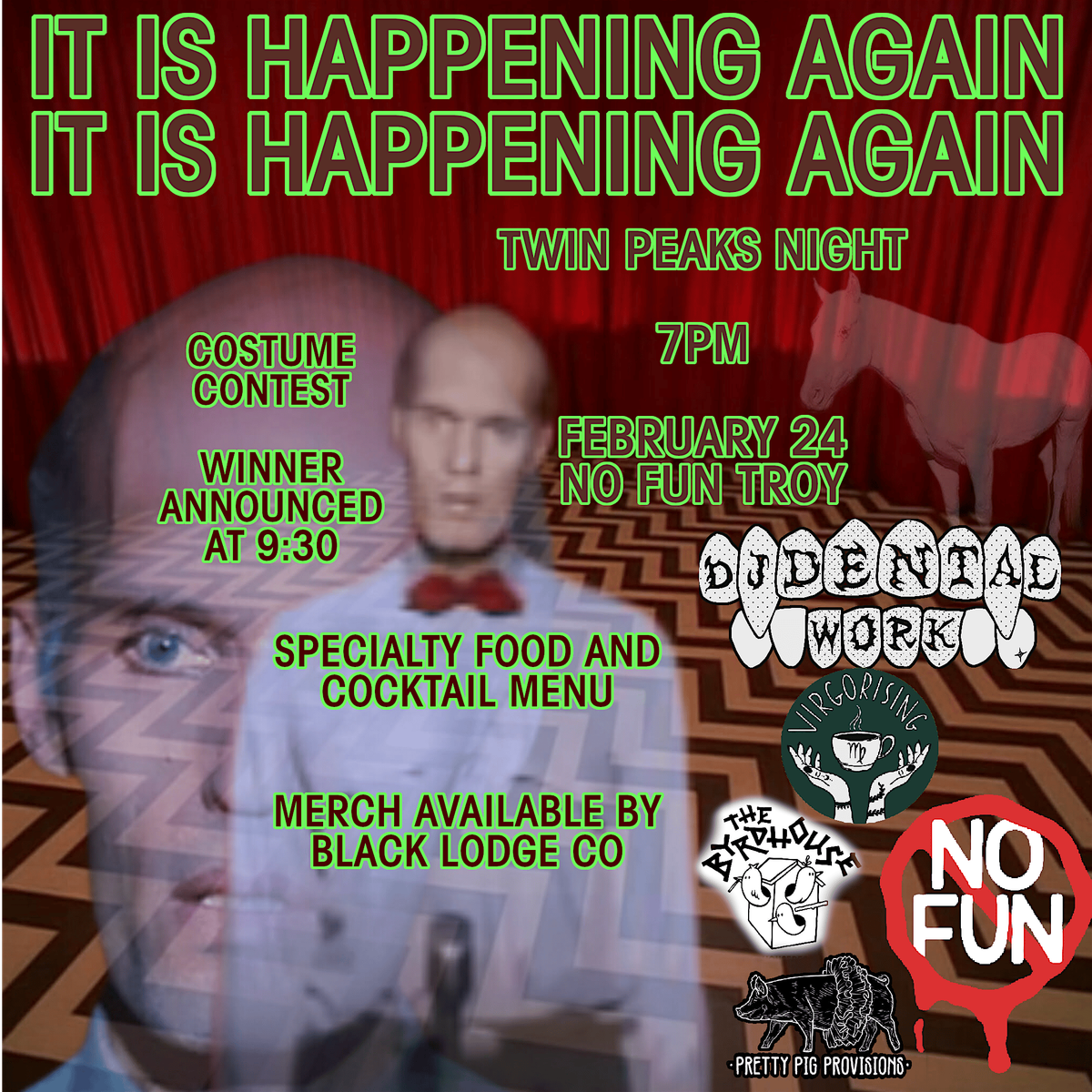 Byrdhouse Records x The Dentist Office presents Twin Peaks Day on February 24th (the day Agent Cooper enters Twin Peaks) at No Fun located at 275 River Street, Troy, NY! The evening runs from 7-11PM and is free entry. 18+ event. Twin Peaks Day features DJ Dental Work, Virgo Rising Coffee, Pretty Pig Provisions, Black Lodge Co., and more! There will be a special themed cocktail and food menu! Make sure to come in contest since we will be holding a costume contest with a chance of winning prizes made by War Toaster!