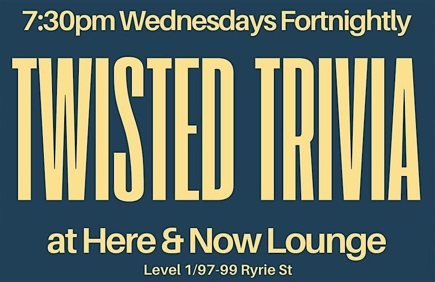 Come on in for a night of side splitting laughs with our comedian hosted Twisted Trivia every Wednesday fortnight at Here & Now Lounge. Book tables of up to 6 of your mates, grab a hot jaffle and a cold drink at the bar and settle in for a night of side splitting laughs while using your mid week brain to score some prizes.