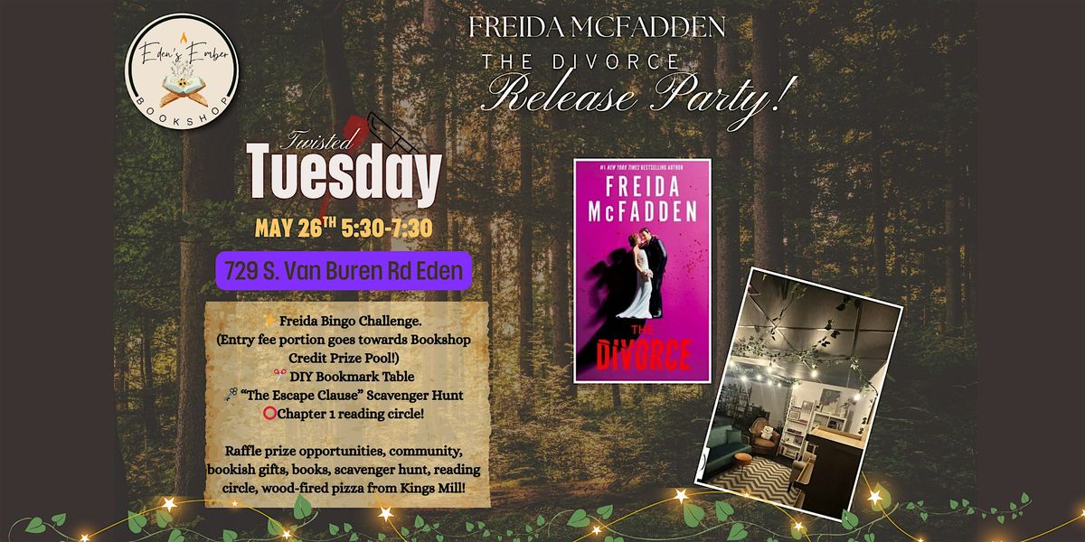 Join us at Eden’s Ember for arelease party celebrating The Divorce written by Freida McFadden.