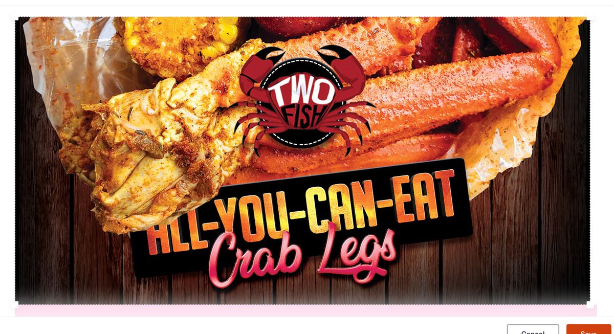 WE HEARD THE REQUESTS SO WE HAD TO BRING IT BACK!!! TWO FISH CRAB SHACK'S ALL YOU CAN EAT CRAB LEG EVENT IS MAKING ITS RETURN!! COME ENJOY AS MANY CRAB LEGS AS YOUR HEART DESIRES IN YOUR FAVORITE SEASONING SAUCE AND SPICE LEVEL. GRAB YOUR FRIENDS AND GET YOUR TICKETS ASAP THEY WILL BE SURE TO SELL OUT QUICK! SEE YOU THERE