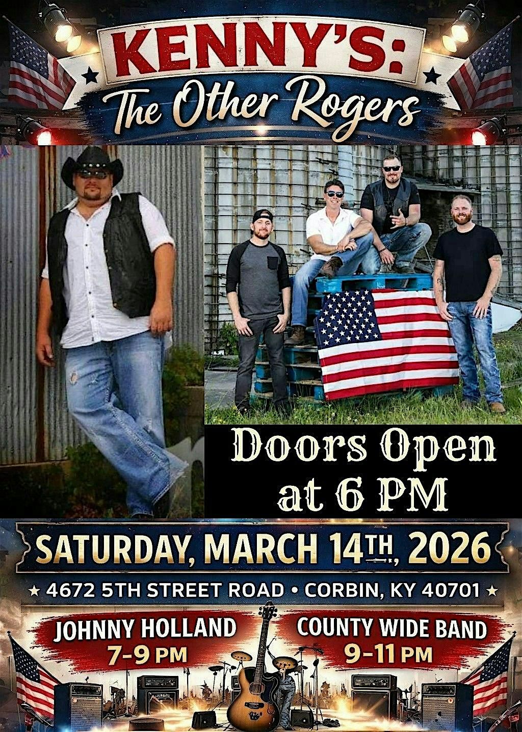 County Wide Band takes the stage at Corbin's first listening room music venue - Kenny's... The Other Rogers! They are joined by Johnny Hollander who takes the stage at 7 PM. Come experience live music the way it was meant to be heard and just enjoy it for what it is!