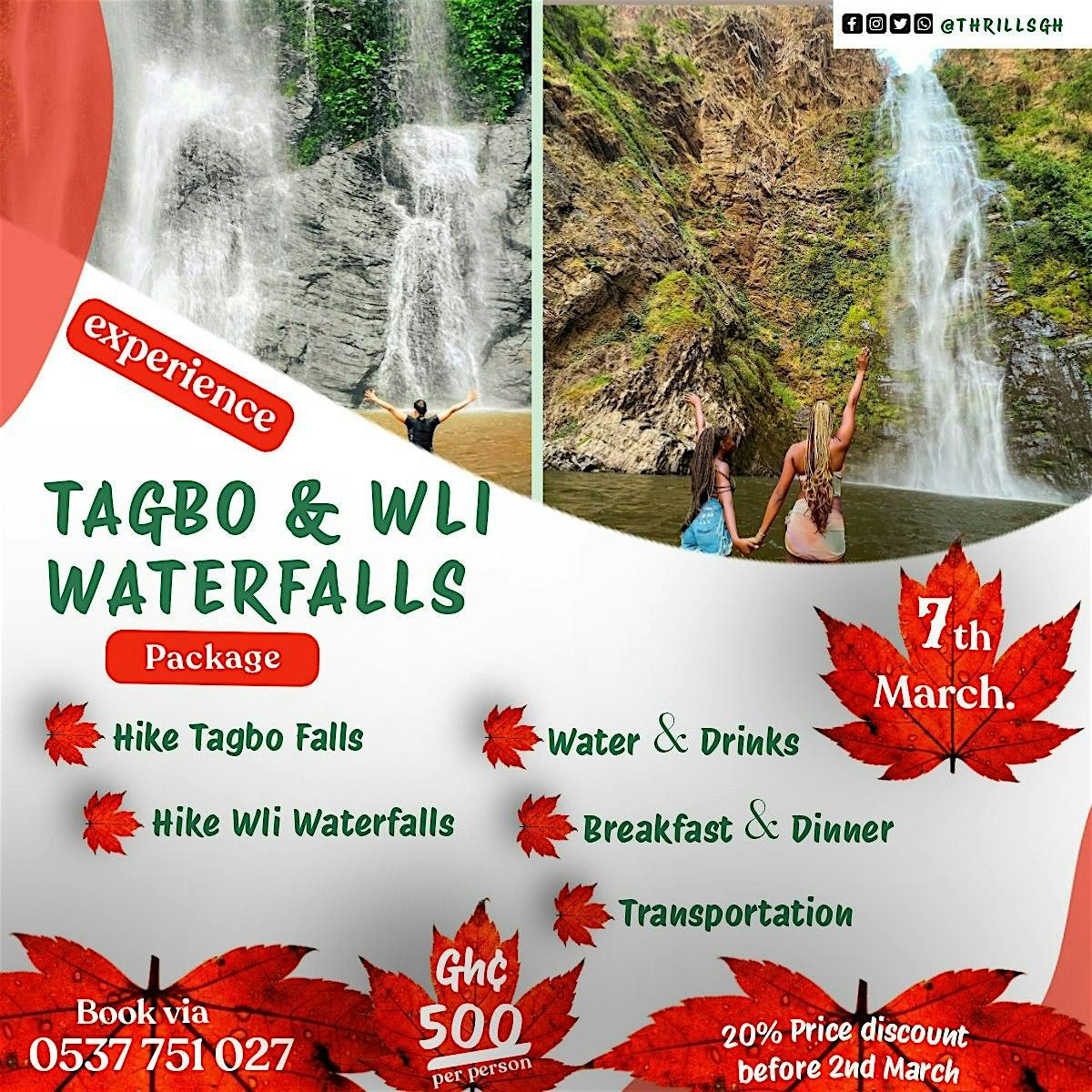 The Two Waterfalls in One Day Trip; New Date and Discount Price are as follows, 7th March, 2026 and Price is 400 cedis for those who would pay before 2nd March.π Prices go back to 500 cedis after 2nd March.π
