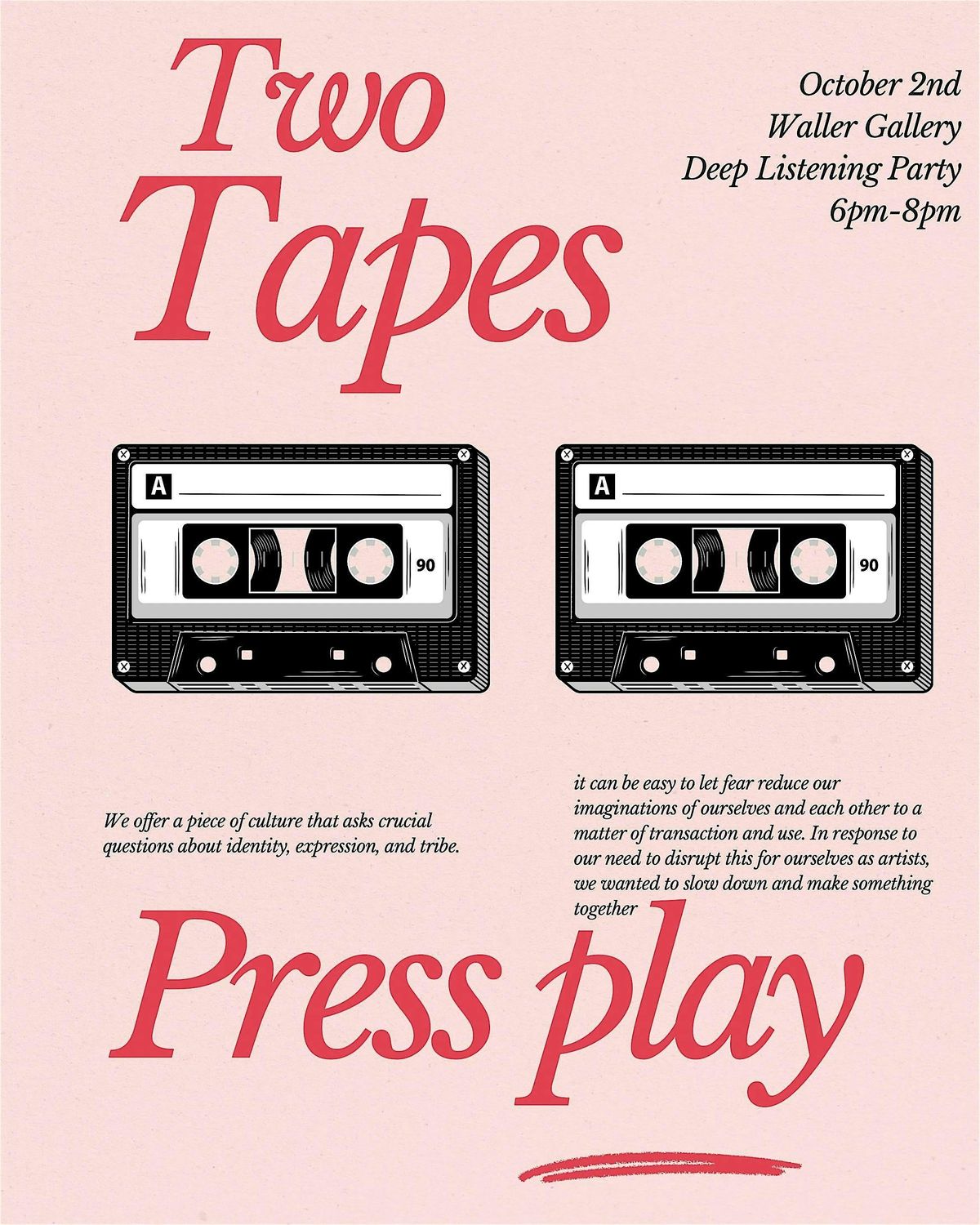 Attention is the deepest expression of love. #TwoTapes deep listening sessions aim to nurture a collective capacity for experiencing audio on purpose, bending the gallery space into a capsule for listening to audio like you would listen to a lover.