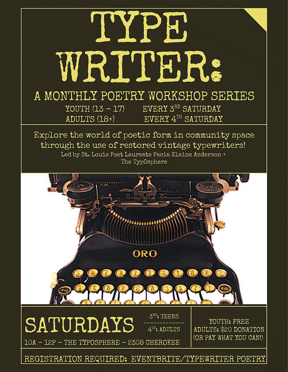 "Typewriter Poetry" is a monthly writer's workshop that teaches various poetic forms in community space through the use of restored vintage typewriters. Each workshop will explore a theme and include instruction on the use of the machines. This workshop is hosted by St. Louis Poet Laureate Pacia Elaine Anderson with gracious support from the LA Marler Typewriter Museum and St. louis Poetry Center. Youth classes (13 - 17 years) happen every third Saturday. Adult classes take place every fourth Saturday. No previous writing or typing experience is necessary; just a curiosity and willingness to learn something new in a whole new way! We will see you there!"