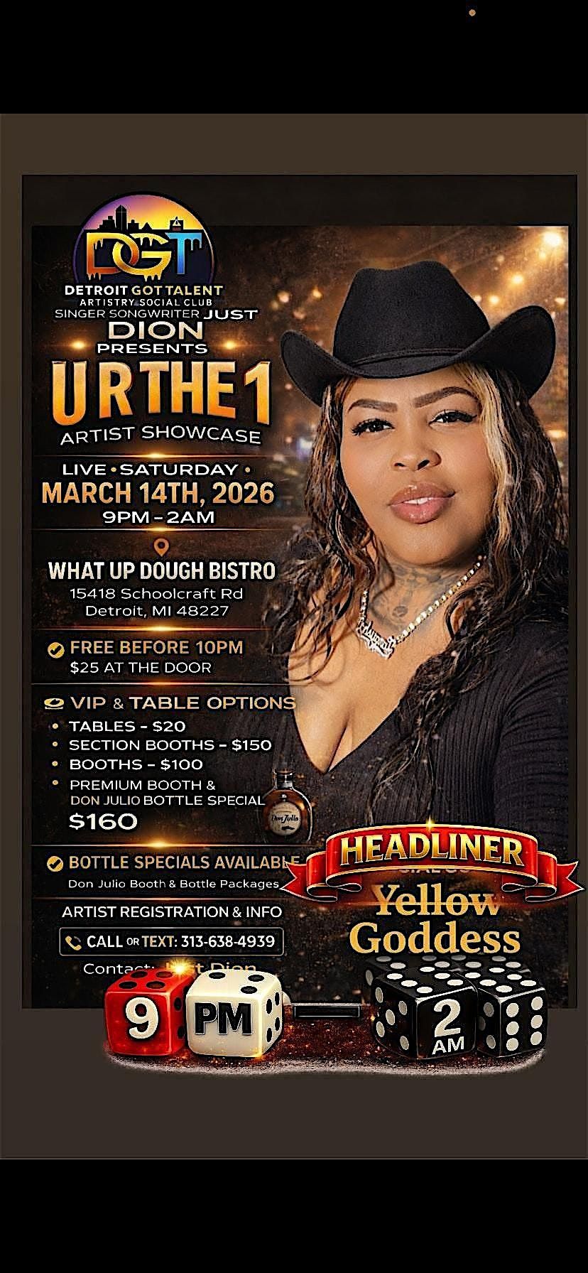 9pm-2am, Don’t miss out on the U ARE THE 1 ARTIST SHOWCASE, PRESENTED BY JUST DION AND DETROIT GOT TALEN. an awesome in-person event where talented artists take the stage to blow your mind. It’s the perfect spot to vibe with great music, discover new sounds, and soak up the energy of live performances. Gather your crew and come join the fun – it’s gonna be lit!