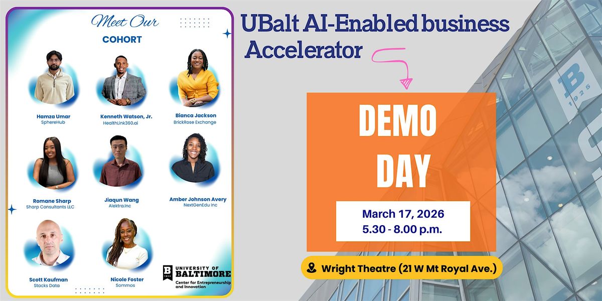 Join us for Demo Day, the culminating event of the inaugural UBalt AI-Enabled Business Accelerator—a nine-week program supporting early-stage founders building AI-enabled ventures in Baltimore.