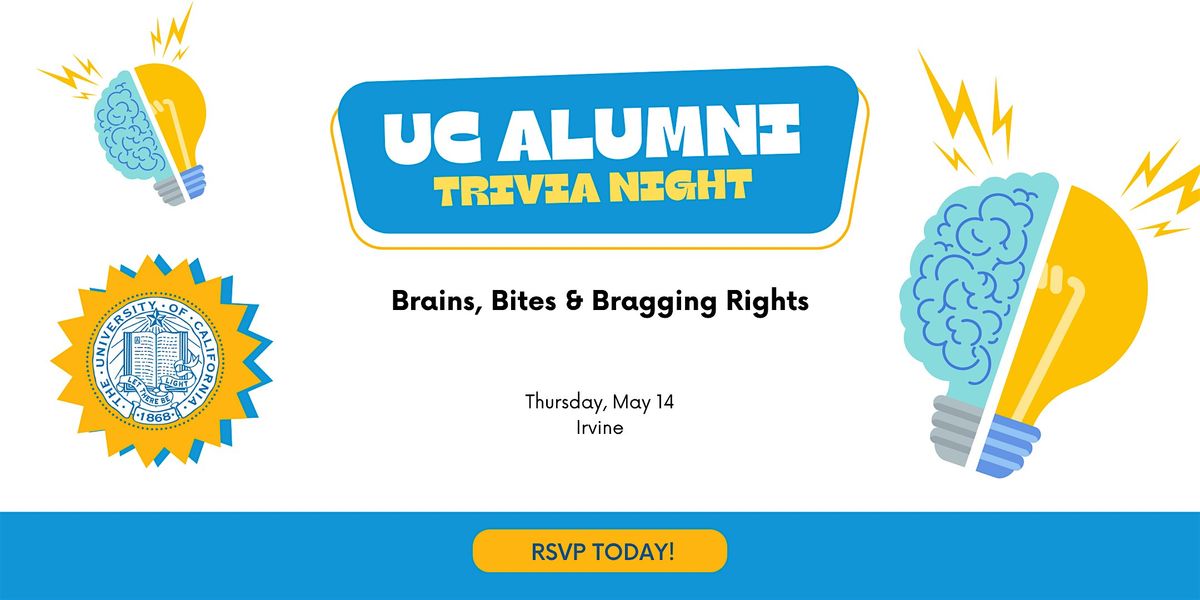 Think you know it all? Curious how much of what you learned in school is still useful? Join our UC Alumni Trivia Night and put your knowledge to the test as part of a team! Alumni from UC Berkeley, UC Irvine, UCLA and UCSD will be competing. Teams with the most correct answers will win prizes, and of course, bragging rights. Light food and drinks will be provided. Join us at 6 Executive Circle in Irvine (near Red Hill and Main) on Thursday, May 14th from 6 to 9 pm. Be sure to cram the night before--and bring your smartest friends!