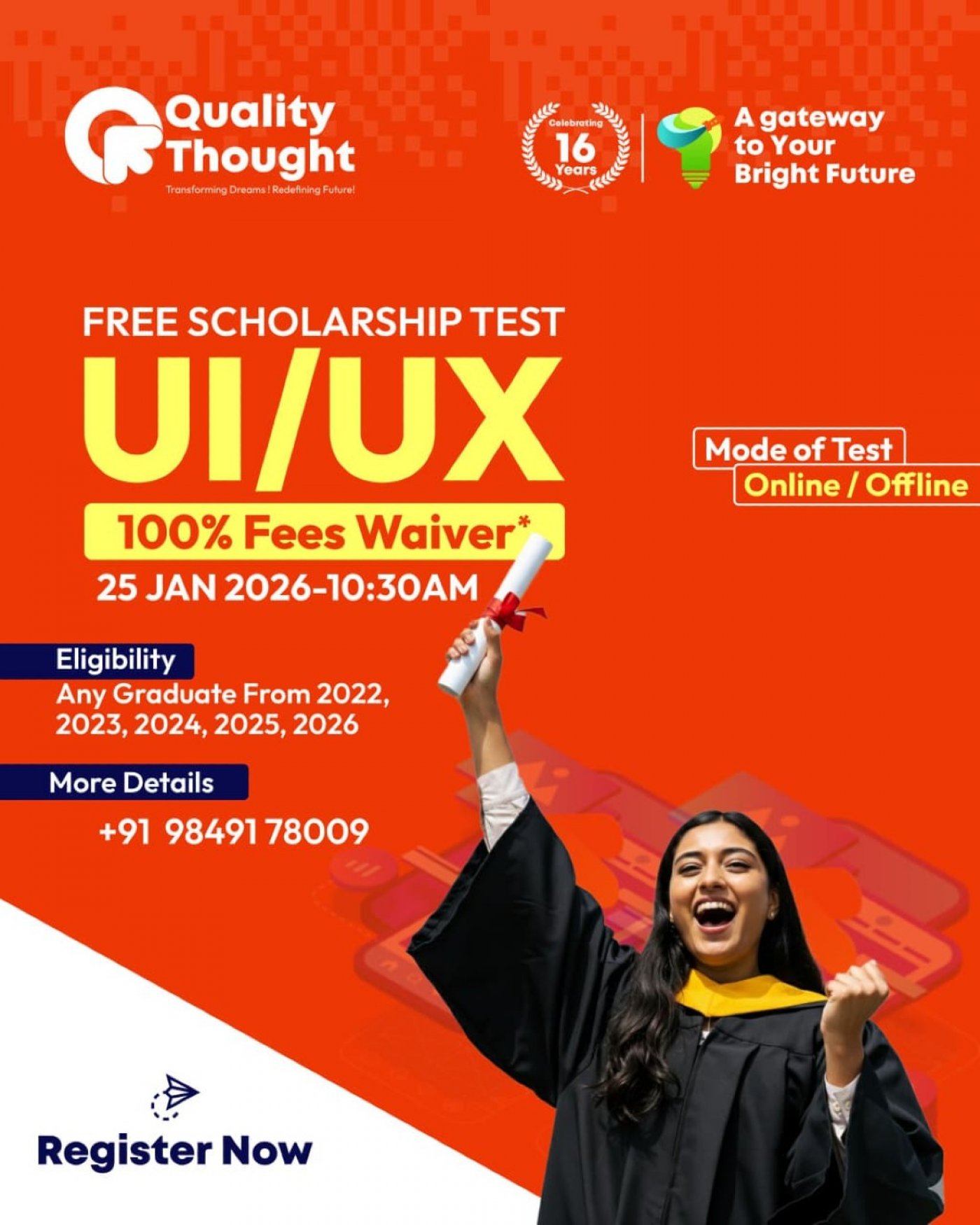 Quality Thought presents a Free UI/UX Scholarship Test designed for students, fresh graduates, and professionals who aspire to build a career in UI/UX design. This scholarship test aims to identify creative and analytical thinkers and reward them with partial to 100% scholarships for professional UI/UX training.