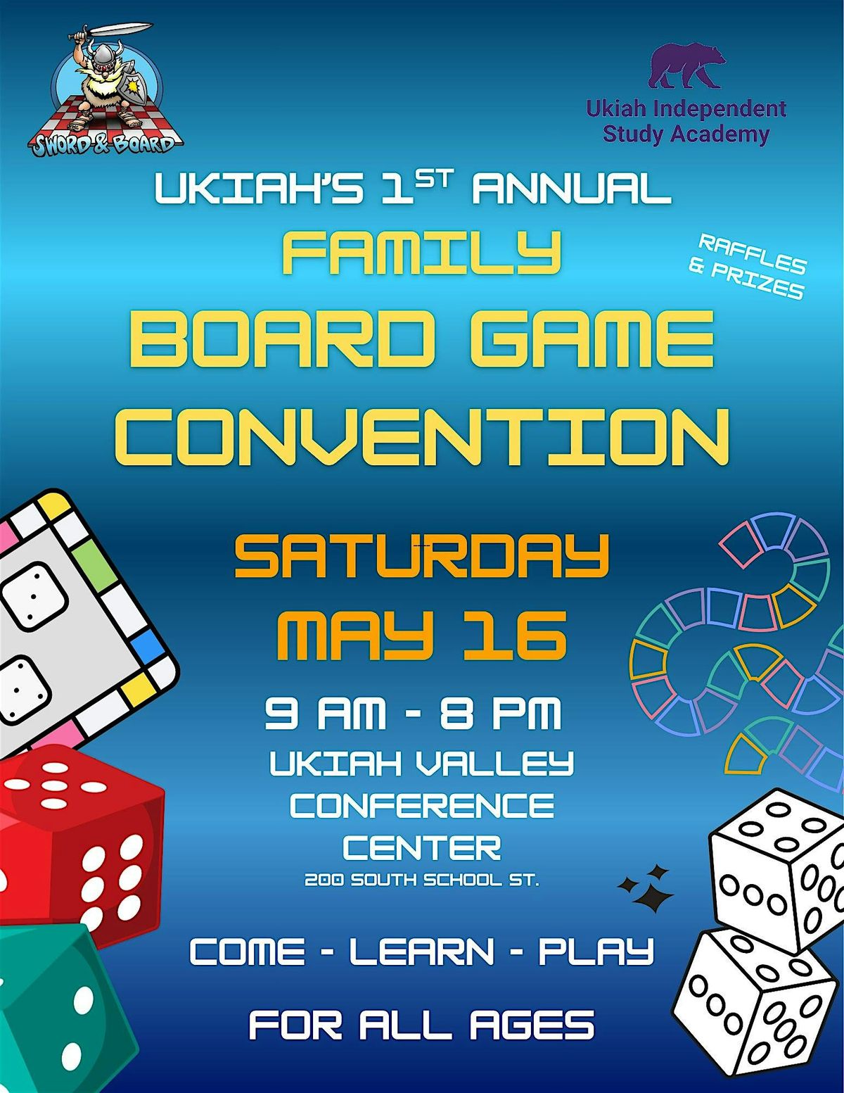 Hosted by Ukiah Independent Study Academy (UISA) and Sword and Board game store, this event features hundreds of board games available to play, learn, and explore. Whether you are a seasoned gamer or have never rolled a die, there is something for everyone.