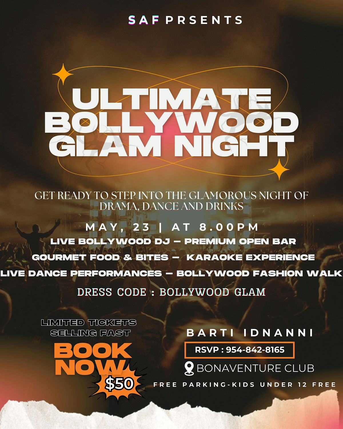 Experience the magic of Ultimate Bollywood Glam Night a high-energy evening filled with electrifying Bollywood beats, a live DJ, premium open bar, gourmet bites, and exciting live performances. Sing your heart out with karaoke, dance the night away, and immerse yourself in a glamorous atmosphere. Dress in your best Bollywood glam look and get ready for an unforgettable night tickets are limited, so don’t miss out!