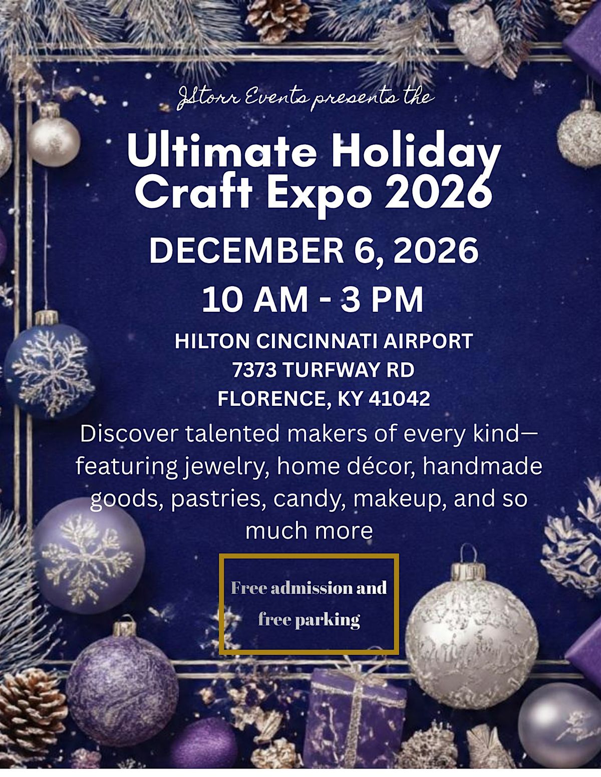 Get into the holiday spirit at the Ultimate Holiday Craft Expo 2026! Join us on Sunday, December 6, 2026 from 10:00 AM to 3:00 PM at the Hilton Cincinnati Airport for a festive day of shopping, creativity, and community.