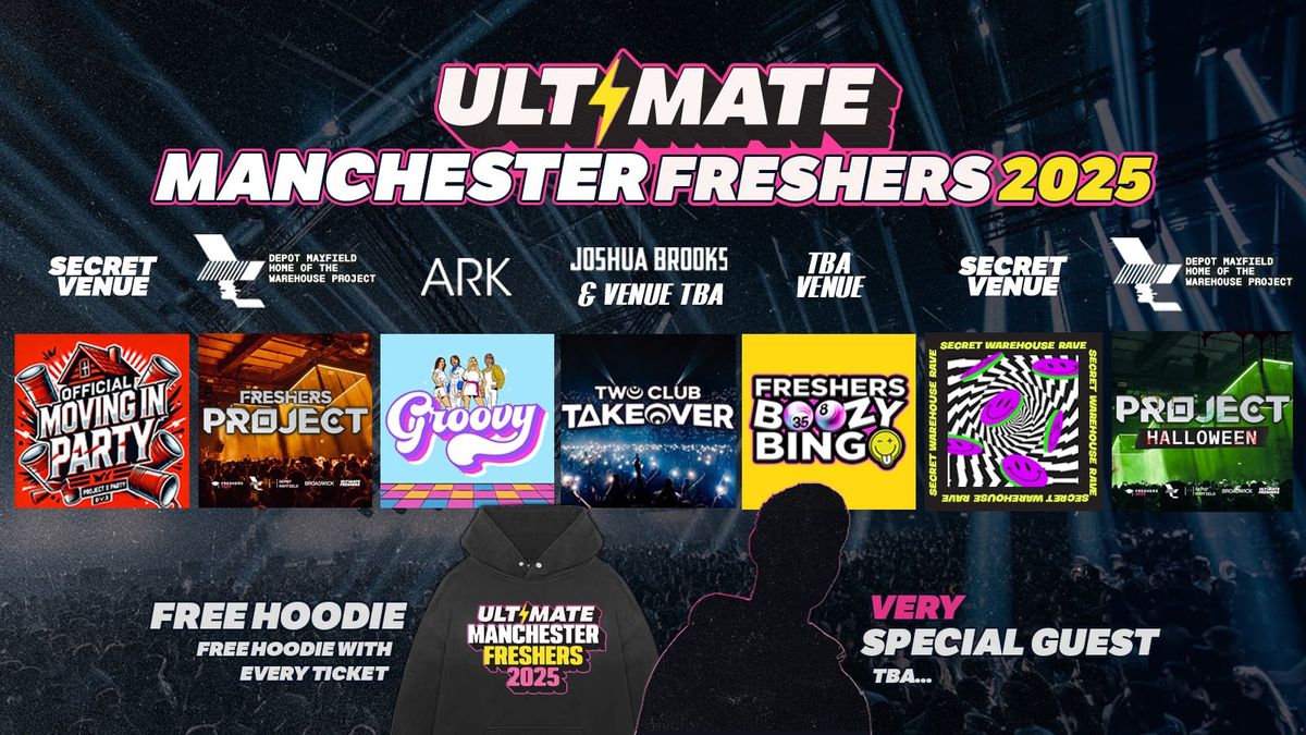 ULTIMATE MANCHESTER FRESHERS 20257 EVENTS - 1 WRISTBAND!⚡ Get ready for the Ultimate freshers week experience of your life and the only ticket to the best events.⚡Ultimate Freshers is the biggest and wildest freshers events of Manchester Freshers Week! Experience Manchester's biggest, best and exclusive venues, unmatched atmosphere and ultimate student vibes.Whether you're looking to make new friends, party hard, or experience the best nightlife your new city has to offer, these are THE events you don’t want to miss.We’ve handpicked the BEST events to guarantee you an unforgettable freshers week! With 10 years of consecutive SELL OUTS, this is the ONLY ticket you need. Once it’s gone, it’s gone.This event sells out early, so buy your fully refundable ticket early to avoid disappointment and save £££.✨FREE ULTIMATE EVENT PERKS ✨👕 FREE FRESHERS HOODIE🎤 VERY SPECIAL GUESTS TBA😎 FREE GROOVY GLASSESPrevious Guests Include: Hev Bowling, Molly Mae, Jay1, Hardy Caprio, Not3s, LUUDE, Joey Essex, Wes Nelson, Tom Zanetti & Many more.🚨 THE ULTIMATE MANCHESTER FRESHERS LINE UP 🚨🏠ULTIMATE EVENT 1: OFFICIAL MOVING IN PARTY🗓DATE: SUNDAY 21ST SEPTEMBER📍VENUE: SECRET VENUE TBA🚨ULTIMATE EVENT 2: THE FRESHERS PROJECT🗓DATE: MONDAY 22ND SEPTEMBER📍VENUE: DEPOT MAYFIELD AT THE WAREHOUSE PROJECTTHE FIRST EVER AND ONLY FRESHERS EVENT TO BE HELD AT THE WAREHOUSE PROJECT!✨ULTIMATE EVENT 3: GROOVY - THE ULTIMATE ABBA + TAYLOR SWIFT EVENT🗓DATE: TUESDAY 23RD SEPTEMBER📍VENUE: ARK🔞ULTIMATE EVENT 4: TWO CLUB TAKEOVER🗓DATE: WEDNEDAY 24TH SEPTEMBER📍VENUE: JOSHUA BROOKS & SECRET VENUE TBA🔥ULTIMATE EVENT 5: FRESHERS BOOZY BINGO🗓DATE: THURSDAY 25TH SEPTEMBER📍VENUE: VENUE TBA✅MUST ADD ON🤫ULTIMATE EVENT 6: SECRET RAVE🗓DATE: FRIDAY 26TH SEPTEMBER📍VENUE: VENUE TBA☠️ULTIMATE EVENT 7: THE HALLOWEEN PROJECT🗓DATE: THURSDAY 30TH OCTOBER📍VENUE: DEPOT MAYFIELD AT THE WAREHOUSE PROJECT✅MUST ADD ONTHE FIRST EVER STUDENT HALLOWEEN EVENT AT THE WAREHOUSE PROJECT 🤡⚠️ ULTIMATE QUEUE JUMP ADD ON ⚠️✅ YOU MUST ADD ON YOUR ULTIMATE QUEUE SKIP TO AVOID BIG QUEUES.