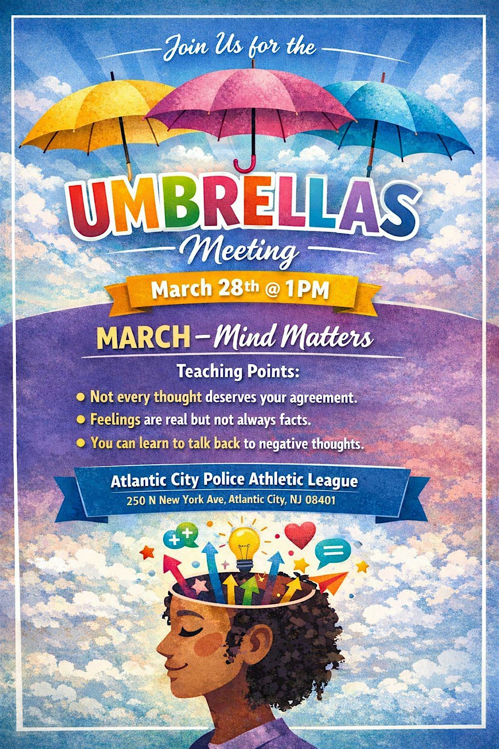 Join us for the Umbrellas Monthly Meeting, where we dive into all things Mind Matters! This is an awesome chance to meet up, share ideas, and explore topics that get your brain buzzing. It’s an in person gathering, so bring your energy and your thoughts!