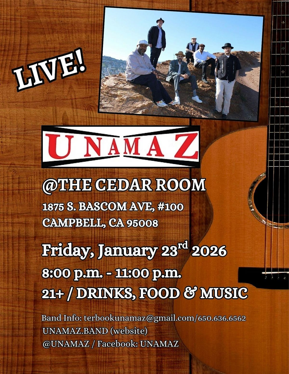 Join us at The Cedar Room for an unforgettable night of live music on January 23rd at 8PM. This dynamic six-piece band blends infectious Latin rhythms, high-energy rock, and soulful grooves into a powerful, dance-ready sound. Come grab a drink, feel the rhythm, and experience a vibrant live performance in an intimate bar setting.