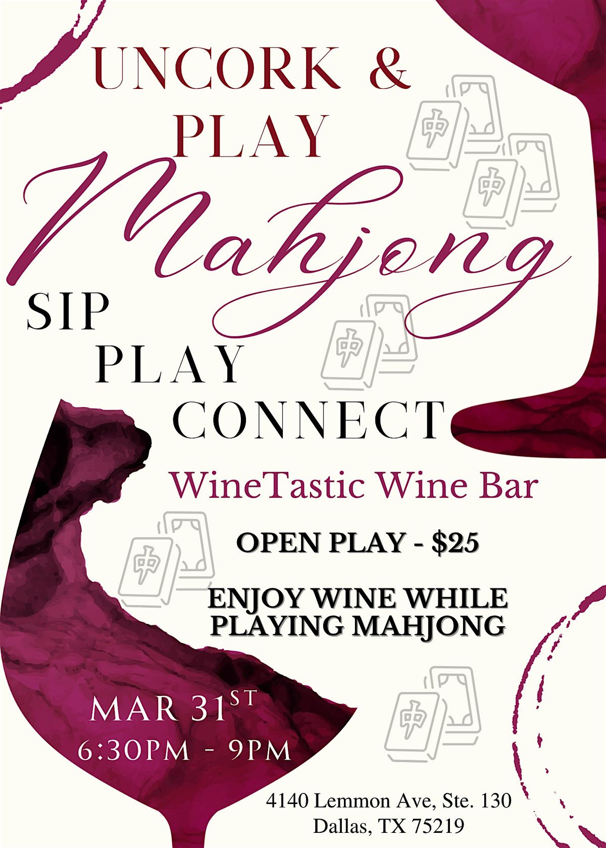 Join us for an intimate evening of tiles, wine, and connection at Uncork & Play Mahjong β a relaxed, elevated open play experience set inside one of Dallasβ favorite neighborhood wine bars.