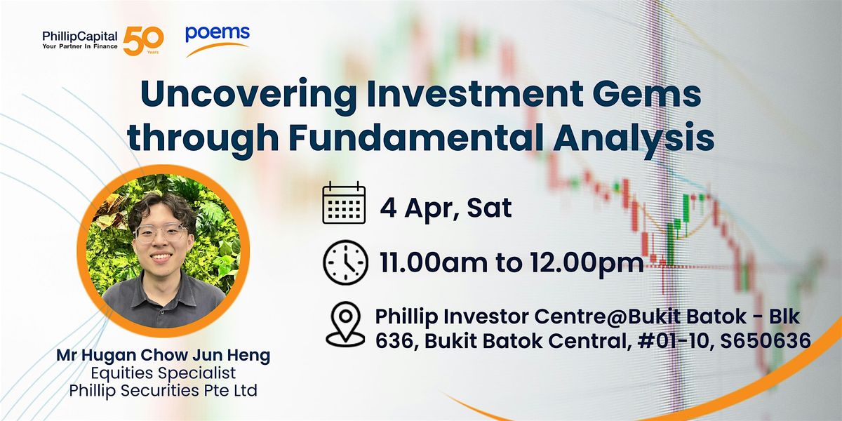 Join us at this seminar on 04 Apr, Sat at 11.00am, where Mr Hugan Chow Jun Heng, Equities Specialist at Phillip Securities, will delve into the art of fundamental analysis. You'll learn how to dig deep into a company's financials, management, and industry to uncover its true value.