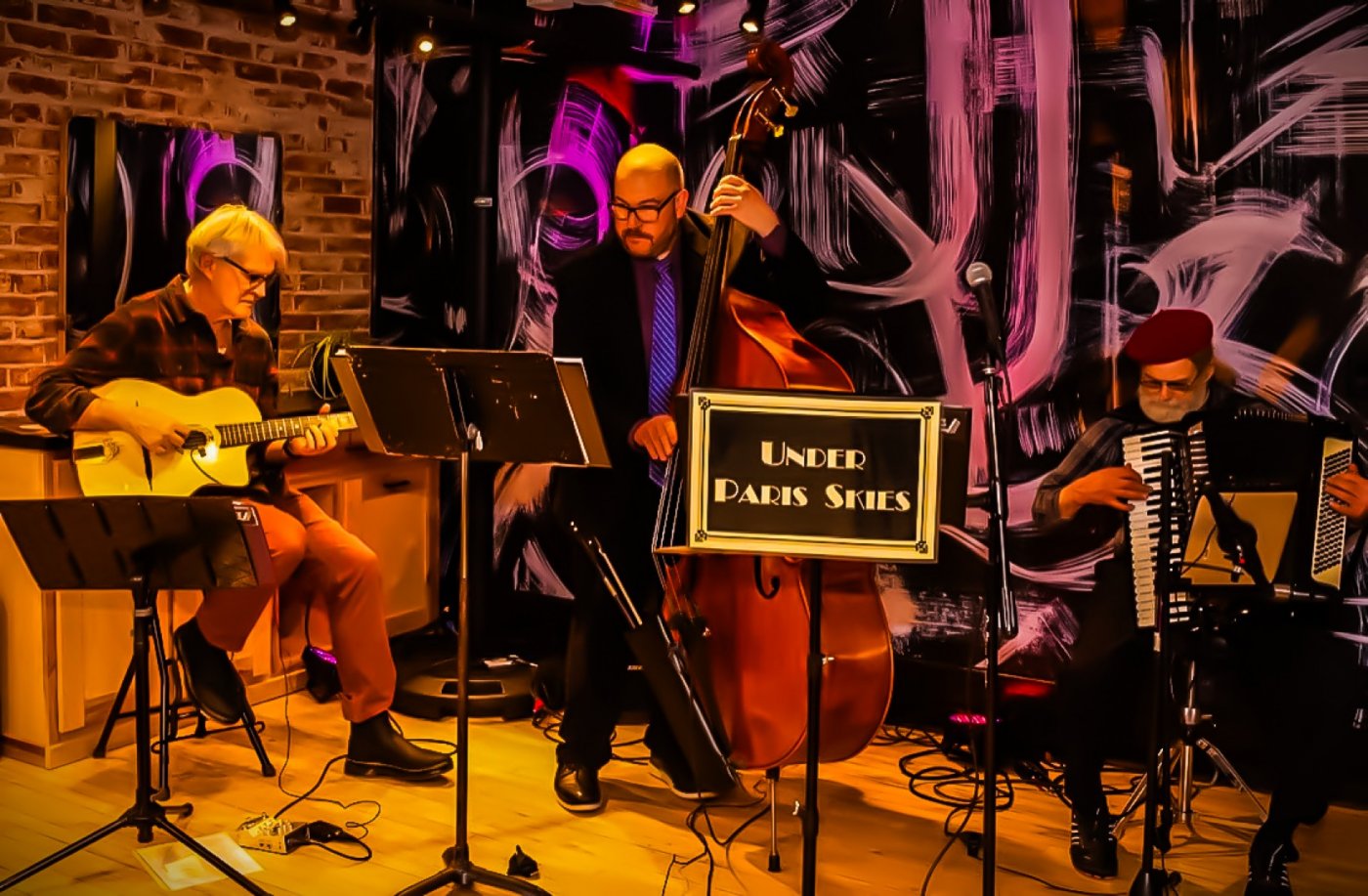 UNDER PARIS SKIES features an acoustic blend of gypsy jazz vintage swing & Latin-influenced music, inspired by early American jazz clubs, French sidewalk cafes, Argentine dance halls and Mediterranean streets