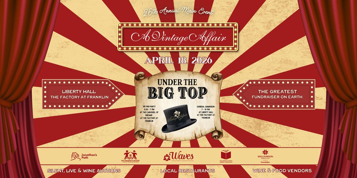 Ladies and Gentleman, Come One, Come All! Step right up and join us on April 18th for "Under the Big Top," the Greatest Fundraiser on Earth! This vintage circus-themed event begins with a VIP Pre-Party at 5:30 held at The Carousel Of Dreams at The Factory At Franklin, where guests can enjoy champagne, signature cocktails, wine from our featured Vintner, delicious hors d'oeuvres, fine cigars, photo ops, performers and much more! VIP tickets are $200 each and include entrance into the Main Event at Liberty Hall!