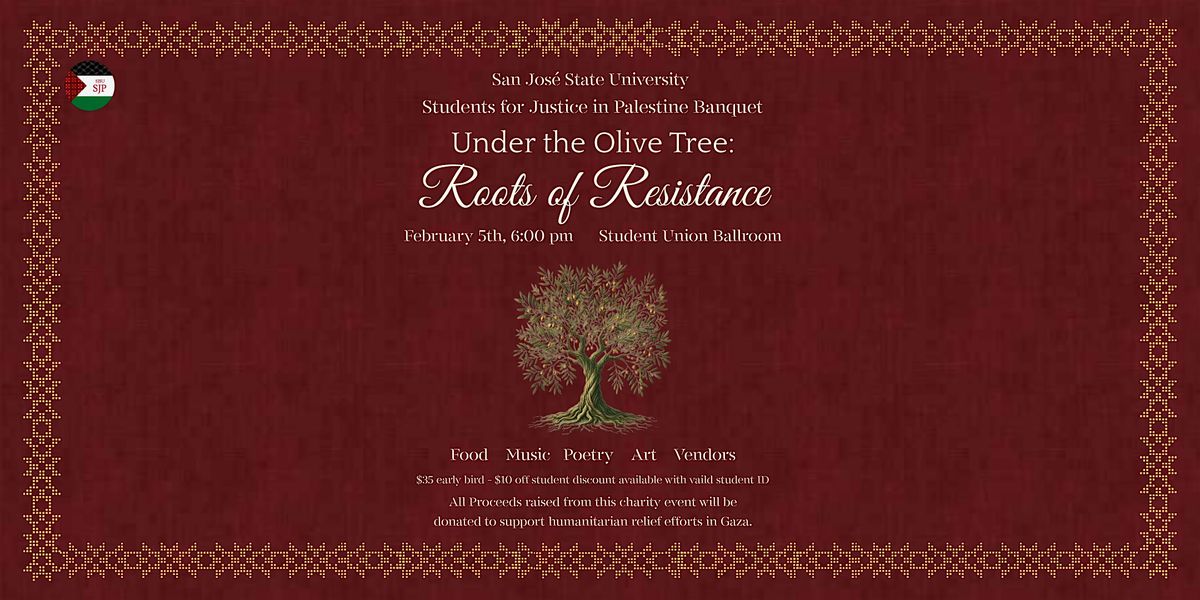 In tribute to the legacy and spirit of Palestine's global resistance, this year’s banquet theme is Under the Olive Tree: Roots of Resistance. In addition, San José State University’s Students for Justice in Palestine will be donating all proceeds from this charitable event to support humanitarian relief efforts in Gaza.