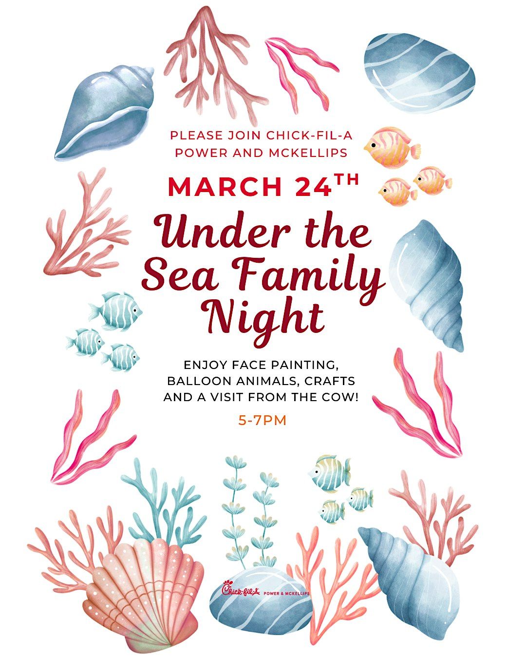 Come dive into an evening of fun and adventure at our Under the Sea Family Night! Bring the whole crew for Balloon animals, Face painting, crafts and a visit from the cow!