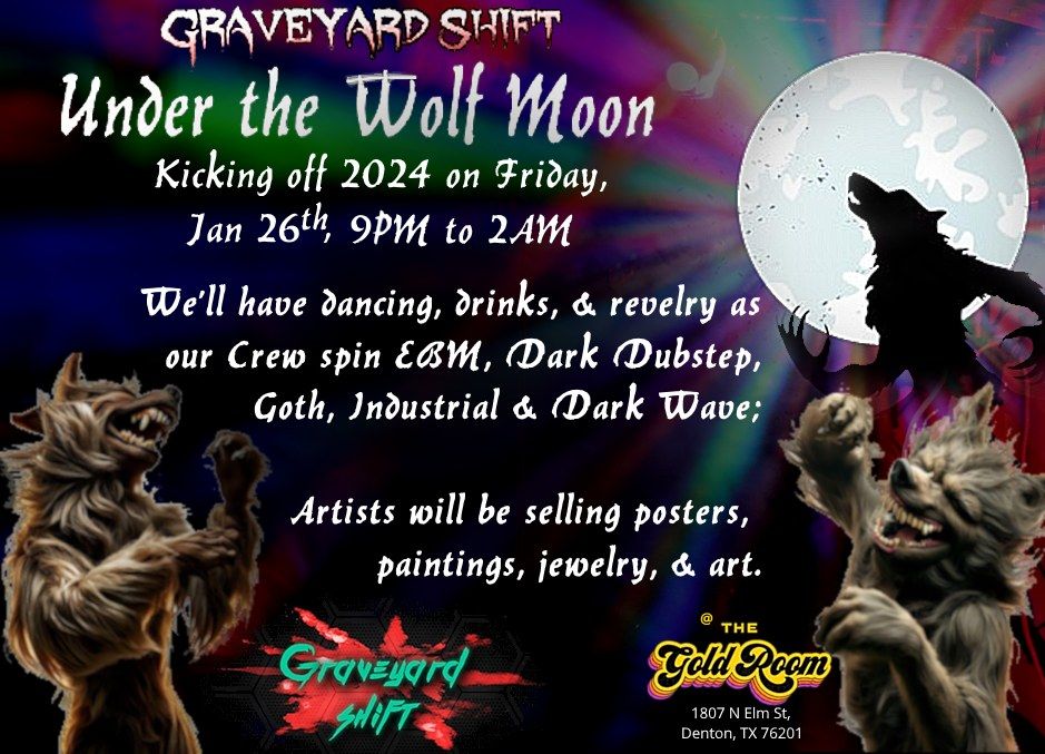 Graveyard Shift is back for 2024 and we are celebrating Under the Wolf Moon!Doors open at 9 and the music goes until 2 in the morning. There will be dance, drink, and revelry as our Crew spin EBM, Dark Dubstep, Goth, Industrial and Dark Wave. Come to the Gold Rooom, 1807 N Elm St in Denton.