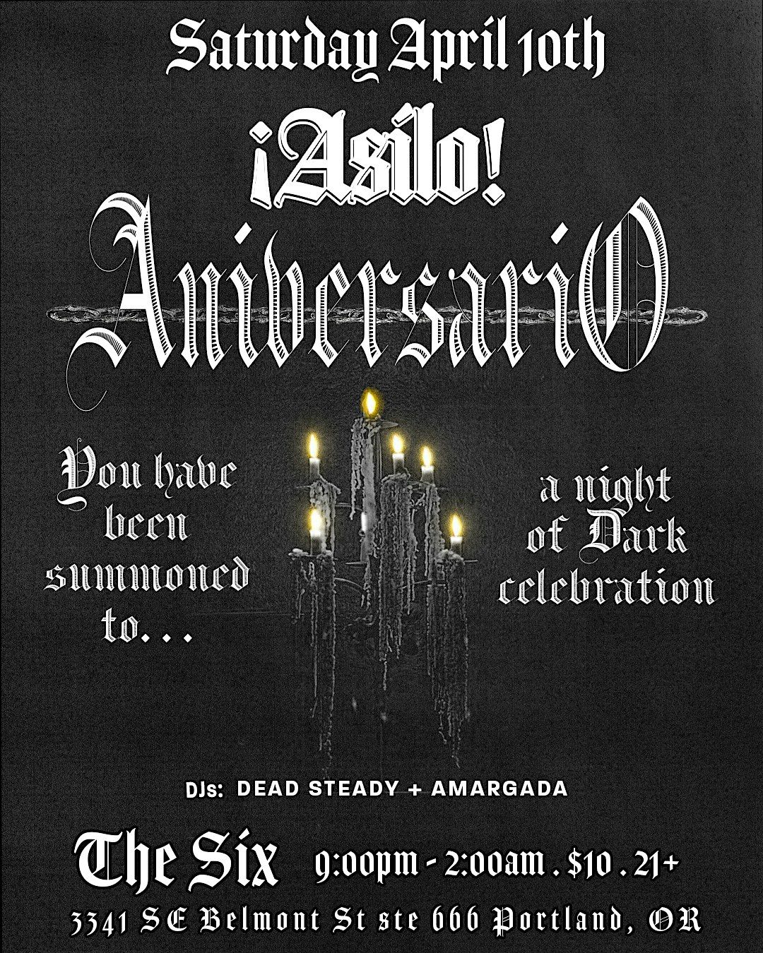 Asilo: Underground Portland Goth Club Anniversary. Saturday, April 10th. One year deeper into the shadows. Dance like the night never ends.You have been summoned to a night of Dark celebration as Asilo proudly reaches another year around the sun, but not without your undying support and love you have shown us all these dark and foggy nights.Goth. Darkwave. Industrial. Post-Punk. Dark Dance Music all night.The Six (below the Midnight bar)3341 SE Belmont St ste 666, Portland, ORSaturday April 10th 20269:00PM - 2:00AM. Ages 21+