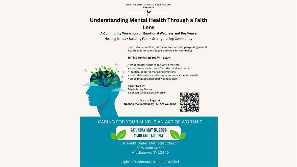 Mental health is an important part of our overall well-being, yet it is often misunderstood or difficult to talk about in faith communities. This interactive workshop provides practical education and tools to help individuals better understand mental health while exploring how faith can support emotional healing and resilience.
