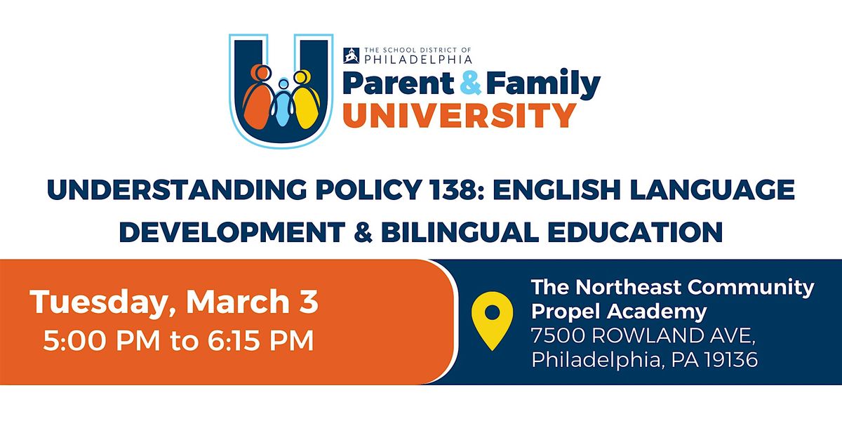Join the Office of Diverse Learners for updates on Policy 138: English Language Development and Bilingual Education. During this session, attendees will learn about the District's programs and supports for multilingual learners and have an opportunity to provide feedback. Educators, administrators, parents, students, community organizations, school district leaders and staff, and all other stakeholders are encouraged to attend. Interpretation services will be provided.