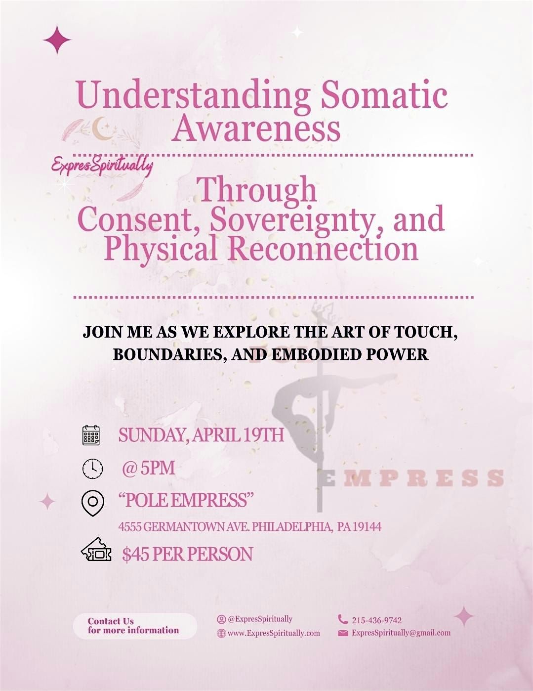 Guided somatic activation using pole floor work movements to reconnect you with sensation, confidence, and desire β’ Education around consent, boundaries, and embodied communication through touch and movement β’ A supportive, trauma-informed space to explore sensuality without pressure, expectation, or performance