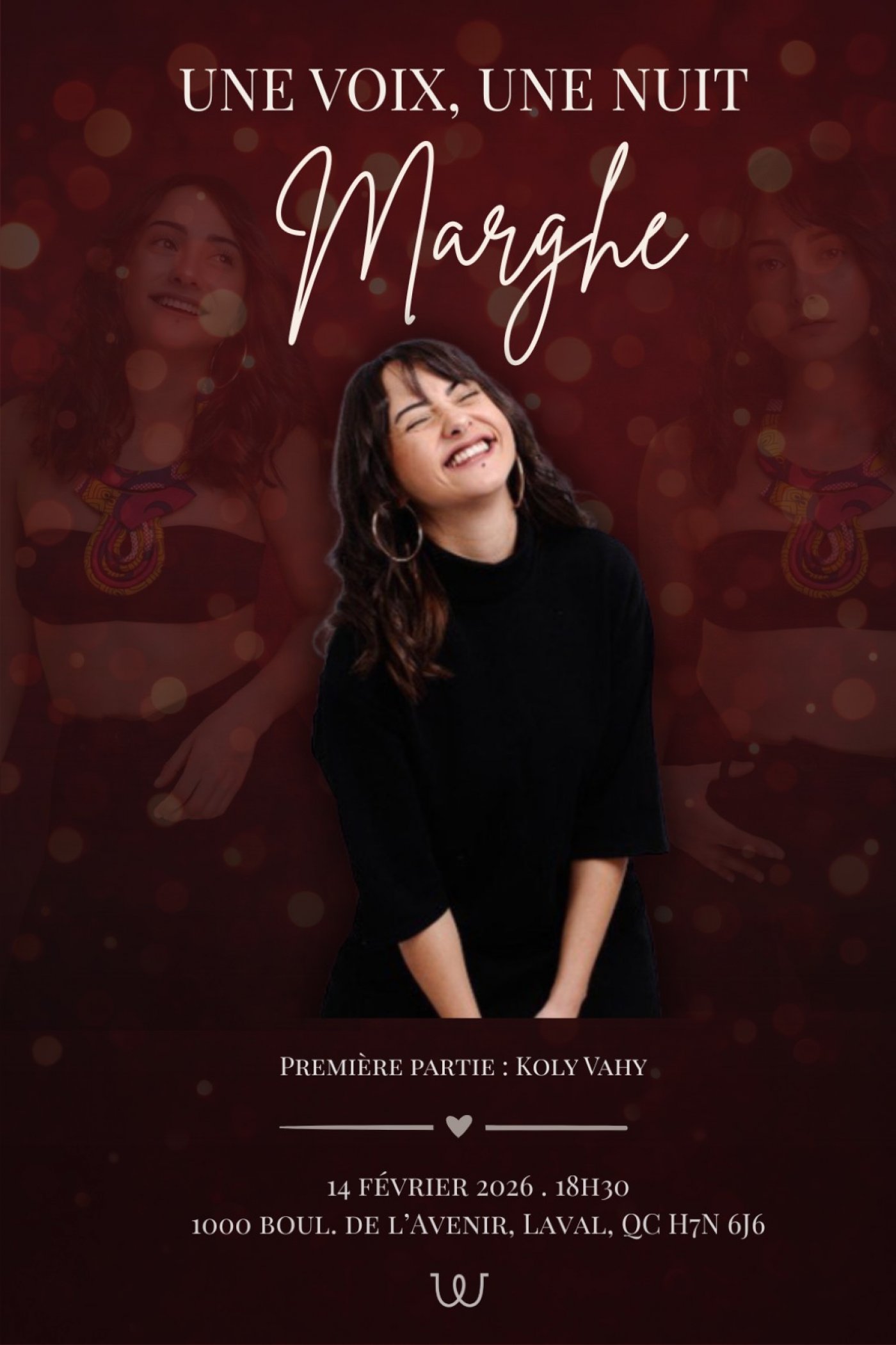 Révélée au grand public en remportant The Voice France saison 10, Marghe séduit par une voix à la fois puissante, sensible et profondément expressive. Originaire de Madagascar, elle a grandi entre cultures et sonorités, ce qui imprègne son univers musical d’une réelle richesse. Après sa victoire, elle lance son premier single “Nouvelle vie” puis son premier album Alefa, métissé entre pop moderne et influences world qui reflète sa personnalité et son parcours. Sur scène, Marghe crée une connexion intime et sincère avec le public, avec élégance, intensité et émotion.