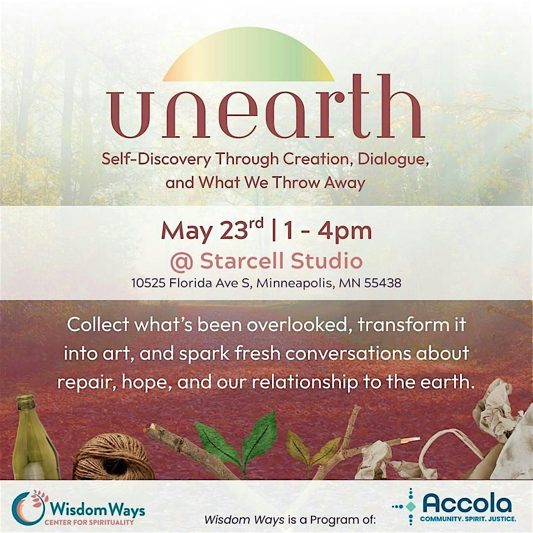 Wisdom Ways’ Unearth: Self-Discovery Art Walk and Discussion invites participants to begin with two simple acts: walking outside to experience nature and, along the way, gathering discarded materials. By engaging in these acts of self-care and care for the planet, what is overlooked or thrown aside becomes the starting point for reflection and creativity. Using the collected items, we will gather on May 23rd from 12-2PM at Starcell Studio in Bloomington and turn waste into art.