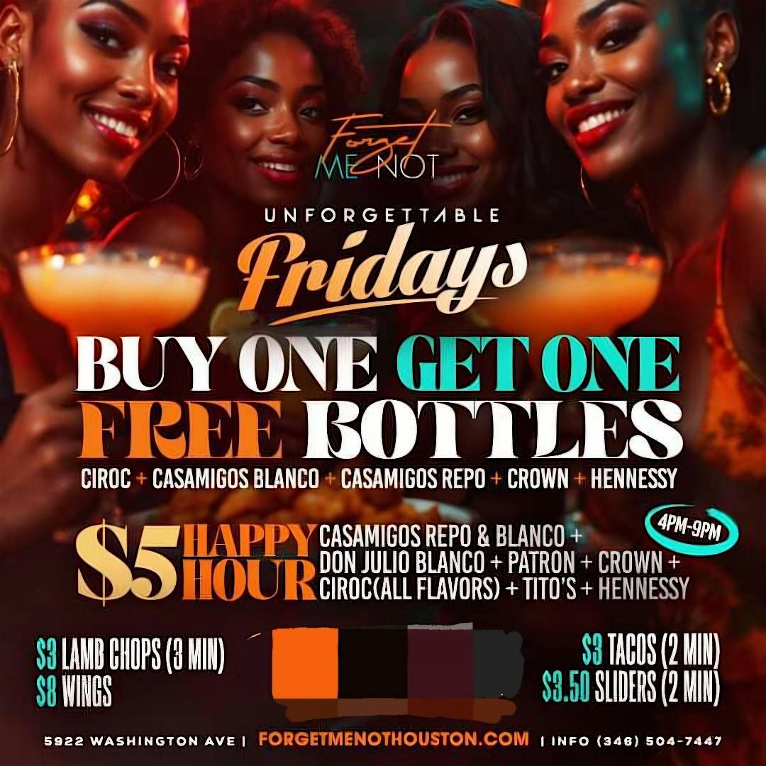 Unforgettable Friday is Vibe Dinning experince. It take place at Forget Me Not Kitchen & Cocktail. Its a Restaurant & Vibe experince with a Dj & MC for entertainment. Also the best drinks and food specials in Houston on a Friday.
