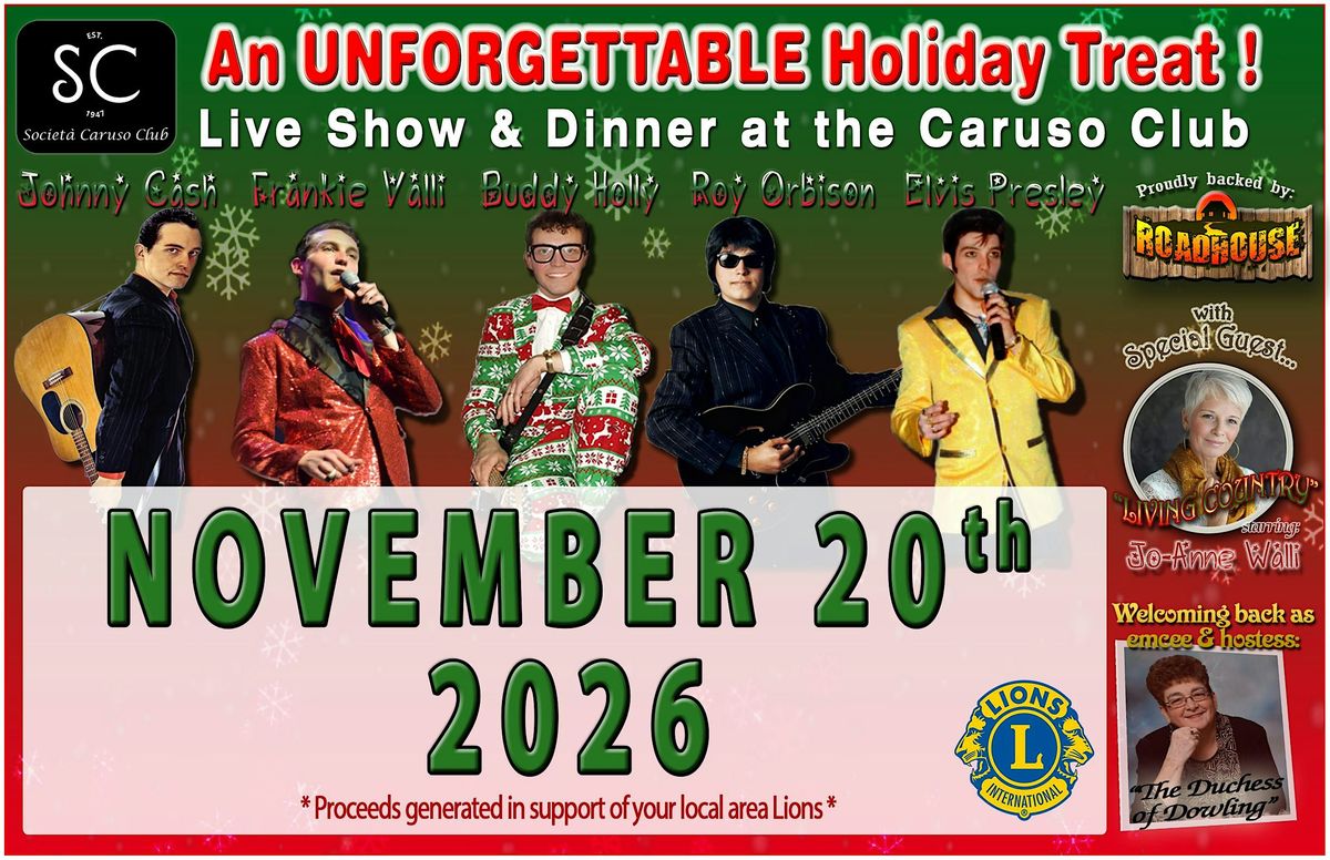 The 5th annual Holiday Dinner/Show at the Caruso Club in support of local Lions, featuring tribute artiste Gavan Rousseau & Roadhouse!About this Event