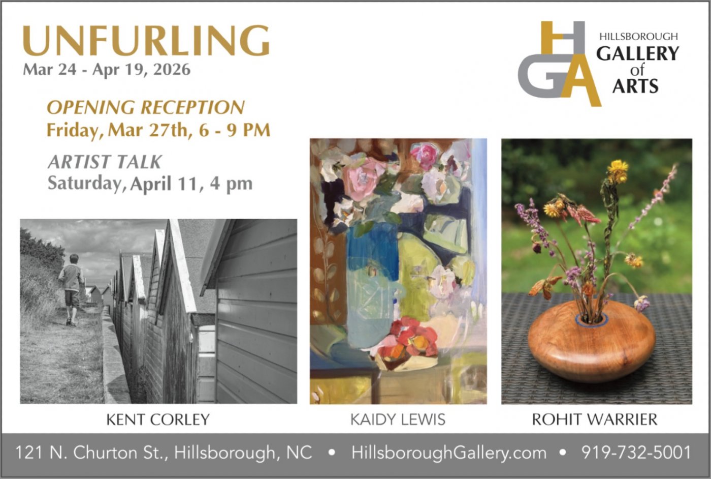The Hillsborough Gallery of Arts presents “Unfurling,” new work by photographer Kent Corley, painter Kaidy Lewis and wood turner Rohit Warrier. The show will open on March 24th and run through April 19th with an opening reception on March 27th during Hillsborough’s Last Friday’s Art Walk. During the reception the Jackson Street Band will perform live music on the patio in front of the gallery.