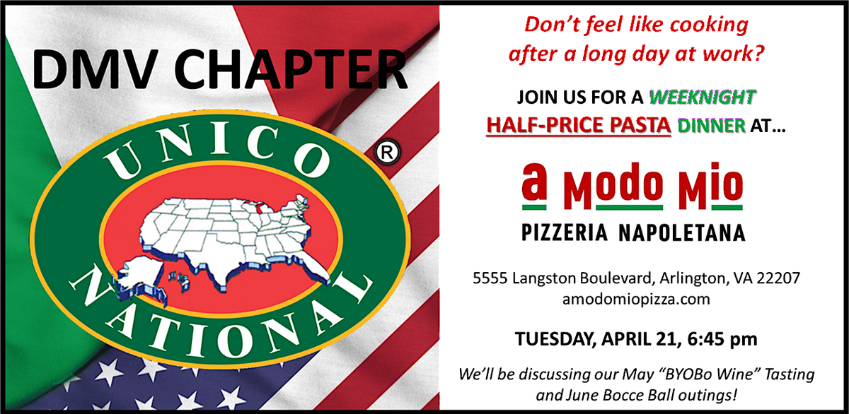 UNICO DMV Half-Price Pasta Dinner & Italian Chat--A Modo Mio, Arlington