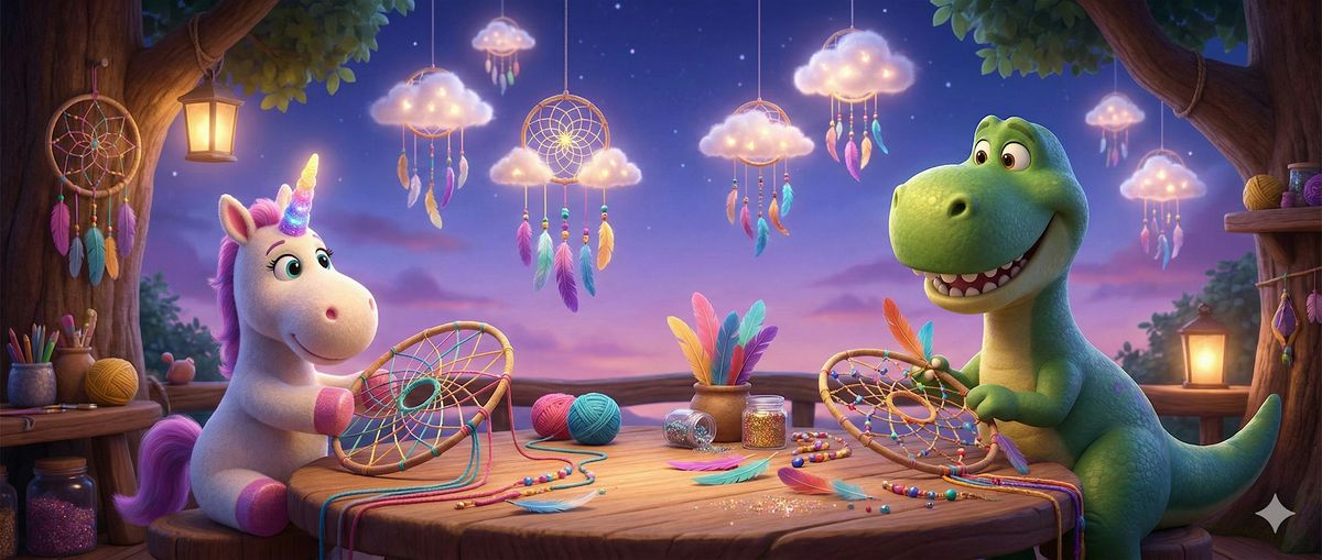 Dream catchers have been used for generations to protect sleep and welcome beautiful dreams. The woven centre is said to catch worries and let only good dreams flow through. In this workshop, children can choose to add unicorn magic or dinosaur guardianship to their dream charm — both powerful protectors in their own unique way.