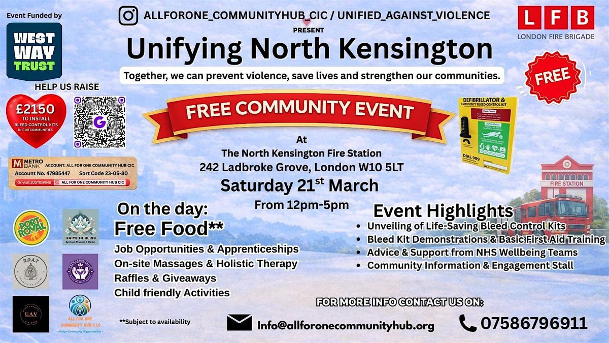 On Saturday 21st March, in partnership with Unified Against Violence C.I.C and the London Fire Brigade, we will be hosting “Unifying North Kensington” - a free community day where all money raised will go towards future events and the purchase and installment of life saving Bleed Control Kits.