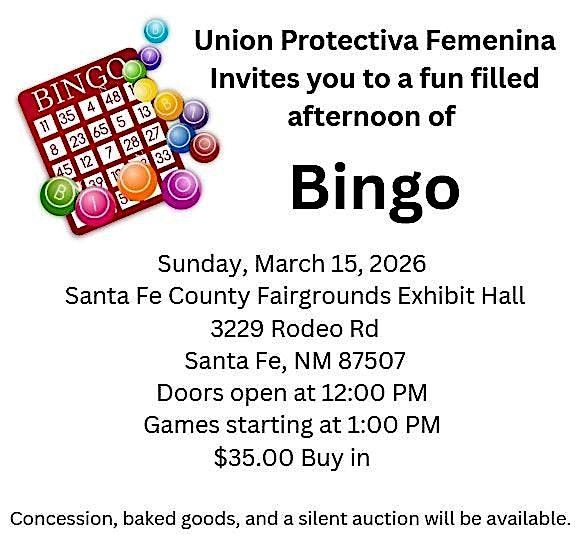 Sunday, March 15, 2026 Santa Fe County Fairgrounds Exhibit Hall 3229 Rodeo Rd Santa Fe, NM 87507 Doors open at 12:00 PM Games starting at 1:00 PM Concession, baked goods, and a silent auction will be available. $35.00 buy in plus extra specials will be available for purchase.