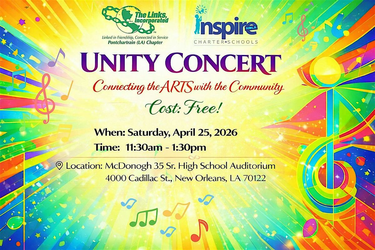 Join the Pontchartrain (LA) Chapter of The Links, Incorporated and InspireNOLA Charter Schools for and unforgettable afternoon where the ARTS come alive and connect with the community like never before. Featuring the InspireNOLA Concert Bands and award winning artists.This is your chance to enjoy amazing performances, meet fellow art lovers, and celebrate creativity together. Don’t miss out on this vibrant event that brings everyone closer through music, dance, and more. Bring your friends and feel the magic of the Unity Concert! Free receptions with light bites and sips will follow the performance!