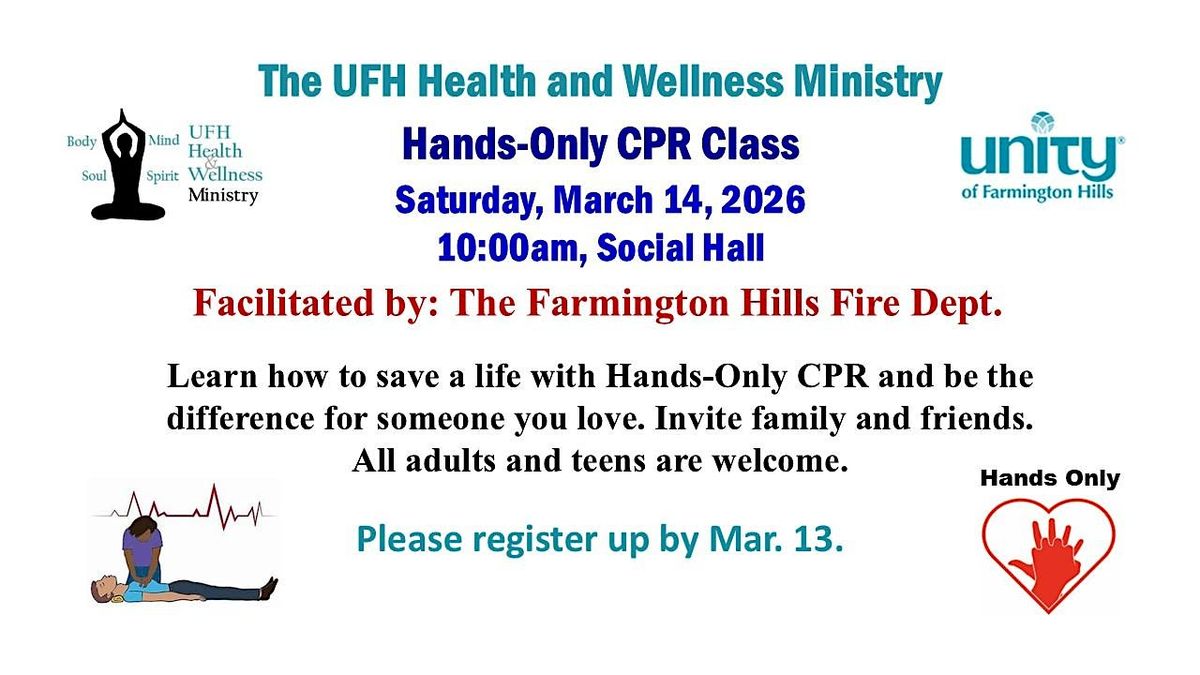 The Farmington Hills Fire Department will be facilitating this Hands-Only CPR class. Learn life-saving skills in a friendly and supportive environment. This free in-person event will cover the basics of hands-only CPR, equipping you to confidently assist in emergencies. Don't miss this opportunity to make a difference and potentially save a life. Sign up today! This is not a class for certification. Adults and teens welcome.