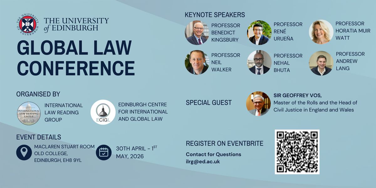 University of Edinburgh Centre for International and Global Law (CIGL), and the International Law Reading Group (ILRG) is jointly organising the University of Edinburgh Global Law Conference, a two day conference on 30 April and 1 May 2026 aiming to gather research that can demonstrate the multifaceted nature of global law, its explanatory power of the contemporary legal order, and deepen the understanding of legal scholarship on the role global law plays to respond to current and future challenges. The conference is held in person only at the University of Edinburgh Old College.