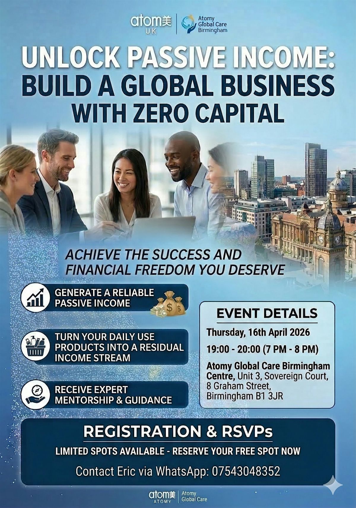 Ready to break free from the 9-to-5 grind? Join us for an in-person event where you'll learn the secrets to earning passive income and creating a global business without spending a dime upfront. Meet like-minded folks, get insider tips, and start building your dream hustle from scratch. Don’t miss out on this game-changer!