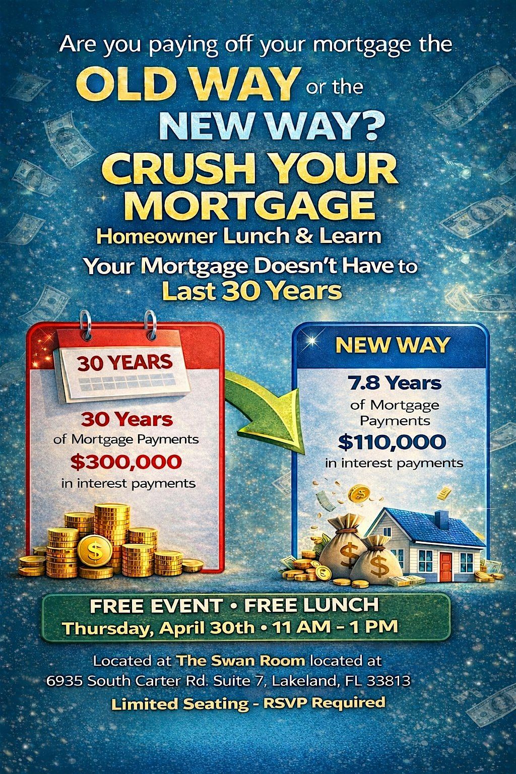 Join us for a powerful, eye-opening financial workshop that reveals a smarter strategy to eliminate debt—including your mortgage—in a fraction of the traditional time. Learn how to use proven financial systems to reduce interest, maximize every dollar, and build long-term wealth without changing your current budget.