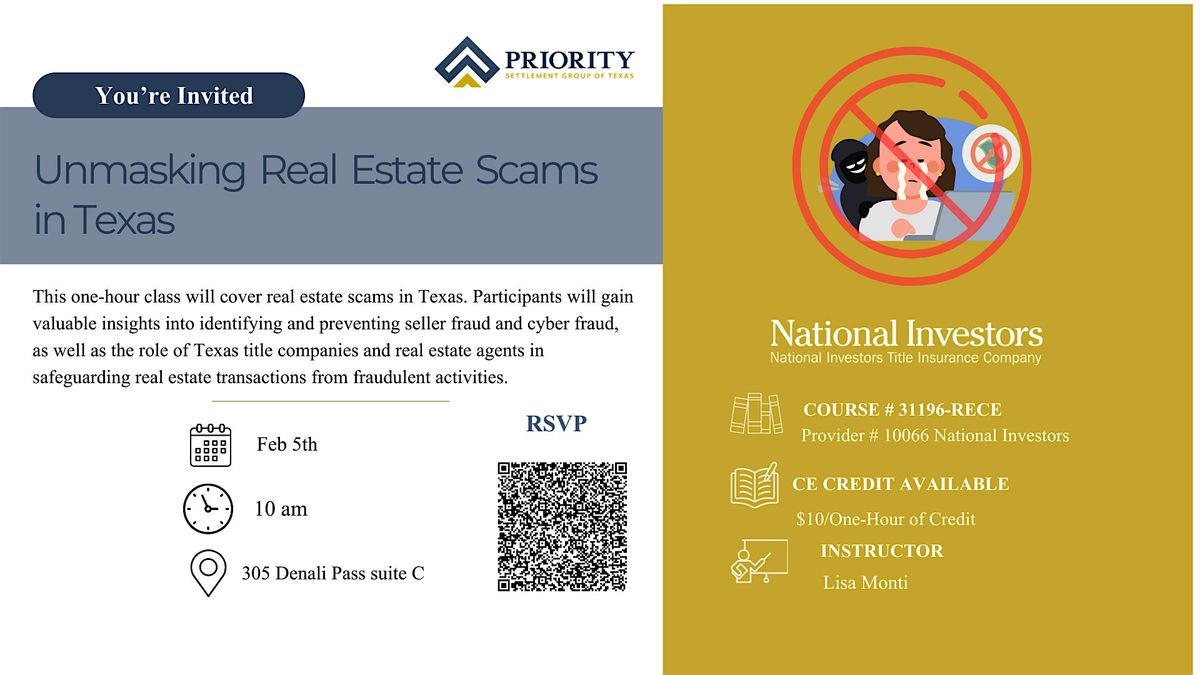 This one-hour class will cover real estate scams in Texas. Participants will gain valuable insights into identifying and preventing seller fraud and cyber fraud, as well as the role of Texas title companies and real estate agents in safeguarding real estate transactions from fraudulent activities.